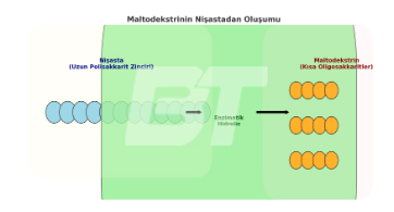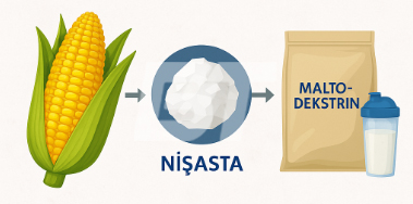 Bilimsel olarak maltodekstrin nişastanın parçalanması ile elde edilen kısa zincirli glikoz molekülleridir. Nişastanın bu parçalanma işlemi enzim veya asitler kullanılarak yapılır ve ortaya çıkan ürün, glikoz zincirinin uzunluğuna göre farklı özellikler gösterebilir. Glikoz zincirlerinin bu gösterdiği özellikler “DE (Dekstroz Eşdeğeri)” adı verilen bir ölçüyle tanımlanmaktadır. DE değeri yükseldikçe maltodekstrin çok daha tatlı ve daha kolay sindirilebilir hale gelir (1).