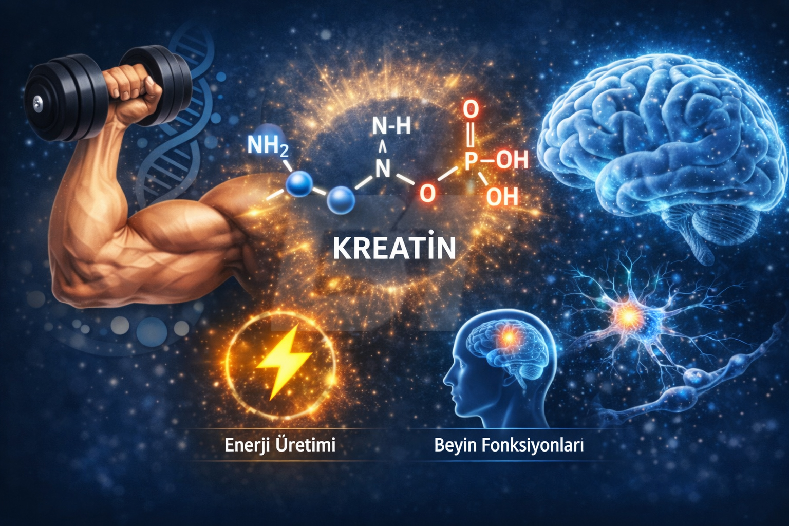 Kreatin; arginin, glisin ve metiyonin aminoasitlerinden sentezlenen, vücutta enerji üretiminde kritik rol oynayan bir bileşik olup, kas hücrelerinde olduğu gibi beyin hücrelerinde de bulunan kreatin-fosfokreatin sistemi sayesinde nöronal hücrelerde ATP üretiminin sürekliliğini sağlayarak yüksek enerji ihtiyacının karşılanmasında önemli bir rol üstlenir (Rae et al., 2003; Brosnan & Brosnan, 2007).