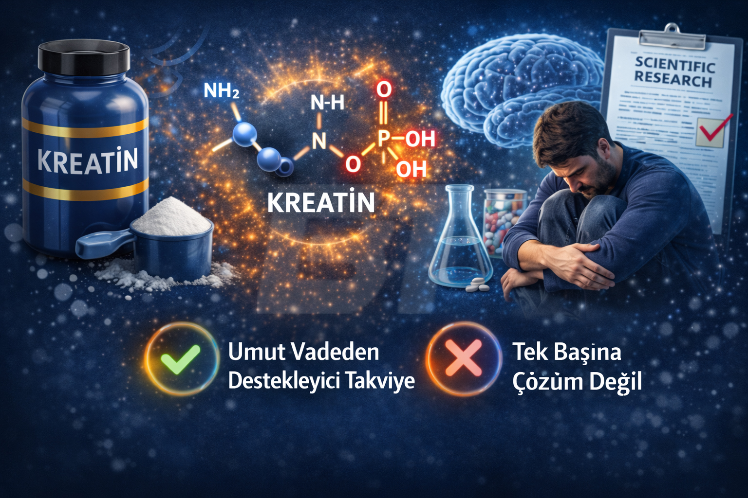 Mevcut bilimsel literatür ışığında kreatinin, depresyon tedavisinde tek başına bir çözüm olmadığı; ancak beyin enerji metabolizmasını desteklemesi, antidepresan tedavilere yanıtı hızlandırabilmesi ve düşük yan etki profili sayesinde uygun bireylerde umut vadeden bir destekleyici (adjunkt) takviye olarak değerlendirilebileceği görülmektedir (Allen, 2012).