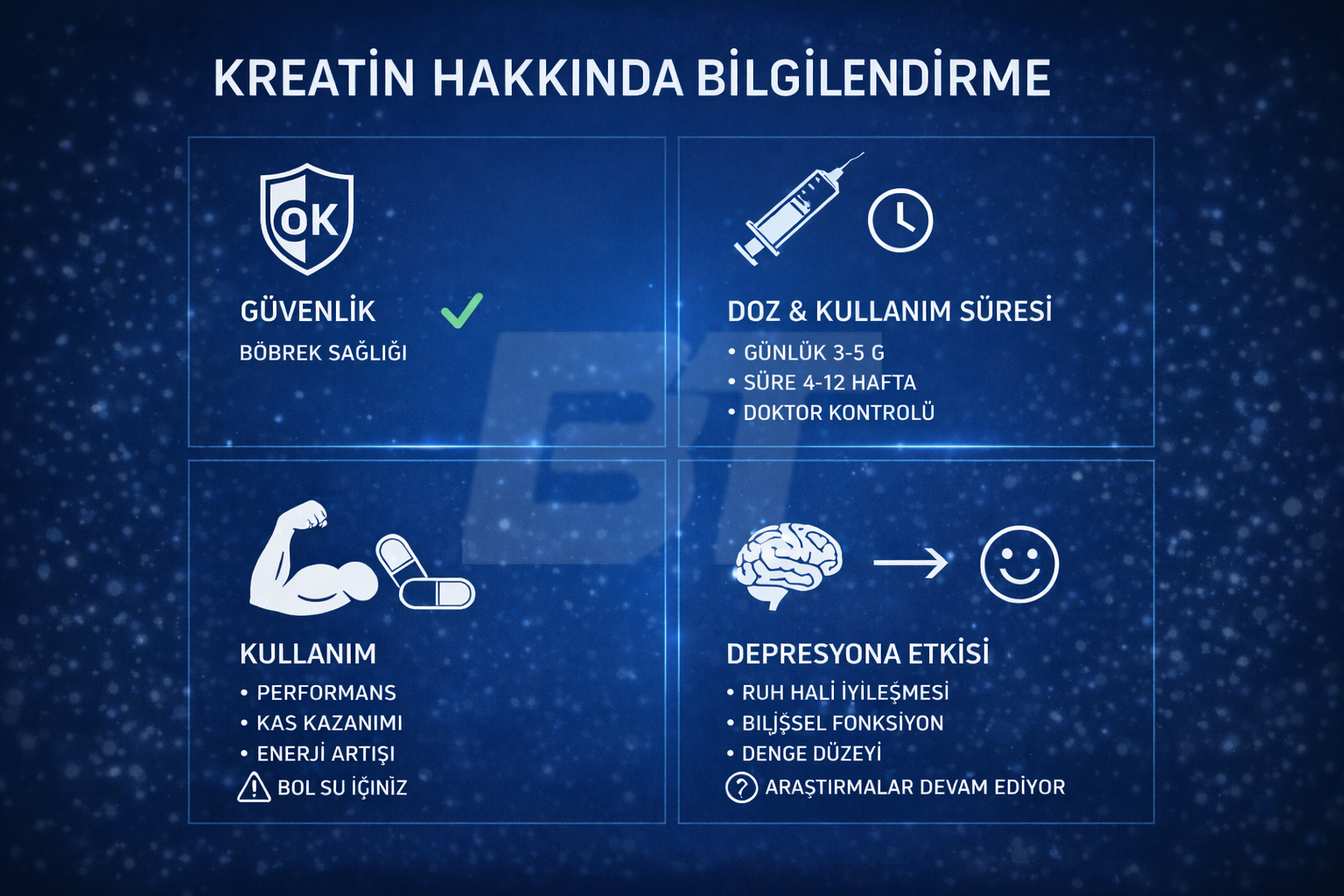 Yine de depresyon çok boyutlu bir durumdur ve tek bir takviyeyle çözülmesi beklenmemelidir. Egzersiz, beslenme, uyku düzeni, psikolojik destek ve tıbbi tedavi bir bütün olarak ele alındığında kreatin, doğru yerde kullanıldığında sürece katkı sağlayabilecek güçlü bir araç olabilir.